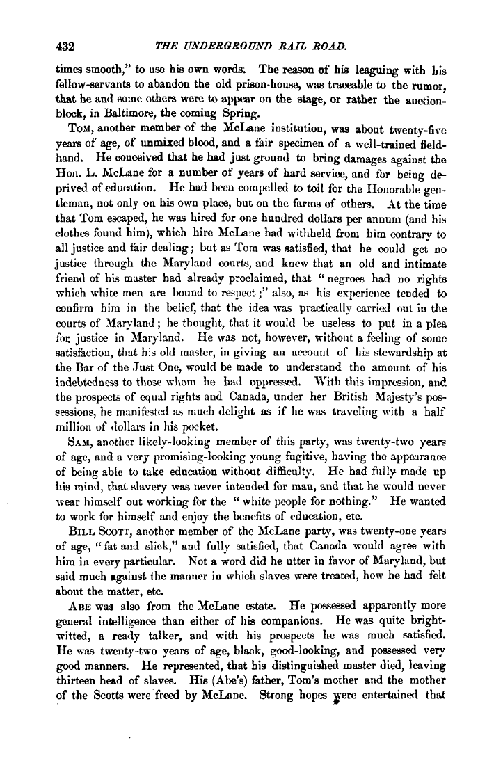 | 432 THE UNDERGROUND RAIL ROAD. times smooth," to use his own words: The reason of his leaguing with his fellow-servants to abandon the old prison-house, was traceable to the rumor, that he and eome others were to appear on the stage, or rather the auction-block, in Baltimore, the coming Spring. TOM, another member of the McLane institution, was about twenty-five years of age, of unmixed blood, and a fair specimen of a well-trained field-hand. He conceived that he had just ground to bring damages against the Hon. L. McLane for a number of years of hard service, and for being deprived of education. He had been compelled to toil for the Honorable gentleman, not only on his own place, but cm the farms of others. At the time that Tom escaped, he was hired for one hundred dollars per annum (and his clothes found him), which hire McLane had withheld from him contrary to all justice and fair dealing; but as Tom was satisfied, that he could get no justice through the Maryland courts, and knew that an old and intimate friend of his master had already proclaimed, that " negroes had no rights which white men are bound to respect;" also, as his experience tended to confirm hira in the belief, that the idea was practically carried out ia the courts of Maryland; he thought, that it would be useless to put in a plea foe justice in Maryland. He was not, however, without a feeling of some satisfaction, that his old master, in giving an account of his stewardship at the Bar of the Just One, would be made to understand the amount of his indebtedness to those whom he had oppressed. With this impression, and the prospects of equal rights and Canada, under her British Majesty's possessions, he manifested as much delight as if lie was traveling with a half million of dollars in his pocket. SAM, another likely-looking member of this party, was twenty-two years of age, and a very promising-looking young fugitive, having the appearance of being able to take education without difficulty. He had fully made up his mind, that slavery was never intended for man, and that he would never wear himself out working for the " white people for nothing." He wanted to work for himself and enjoy the benefits of education, etc. BILL SCOTT, another member of the McLane party, was twenty-one years of age, " fat and slick," and fully satisfied, that Canada would agree with him in every particular. Not a word did he utter in favor of Maryland, but said much against the manner in which slaves were treated, how he had felt about the matter, ete. ABE was also from the McLane estate. He possessed apparently more general intelligence than either of his companions. He was quite bright-•\vitted, a ready talker, and with his prospects he was much satisfied. He was twenty-two years of age, black, good-looking, and possessed very good manners. He represented, that his distinguished master died, leaving thirteen head of slaves. His (Abe's) father, Tom's mother and the mother of the Scotts were freed by McLane. Strong hopes were entertained that |