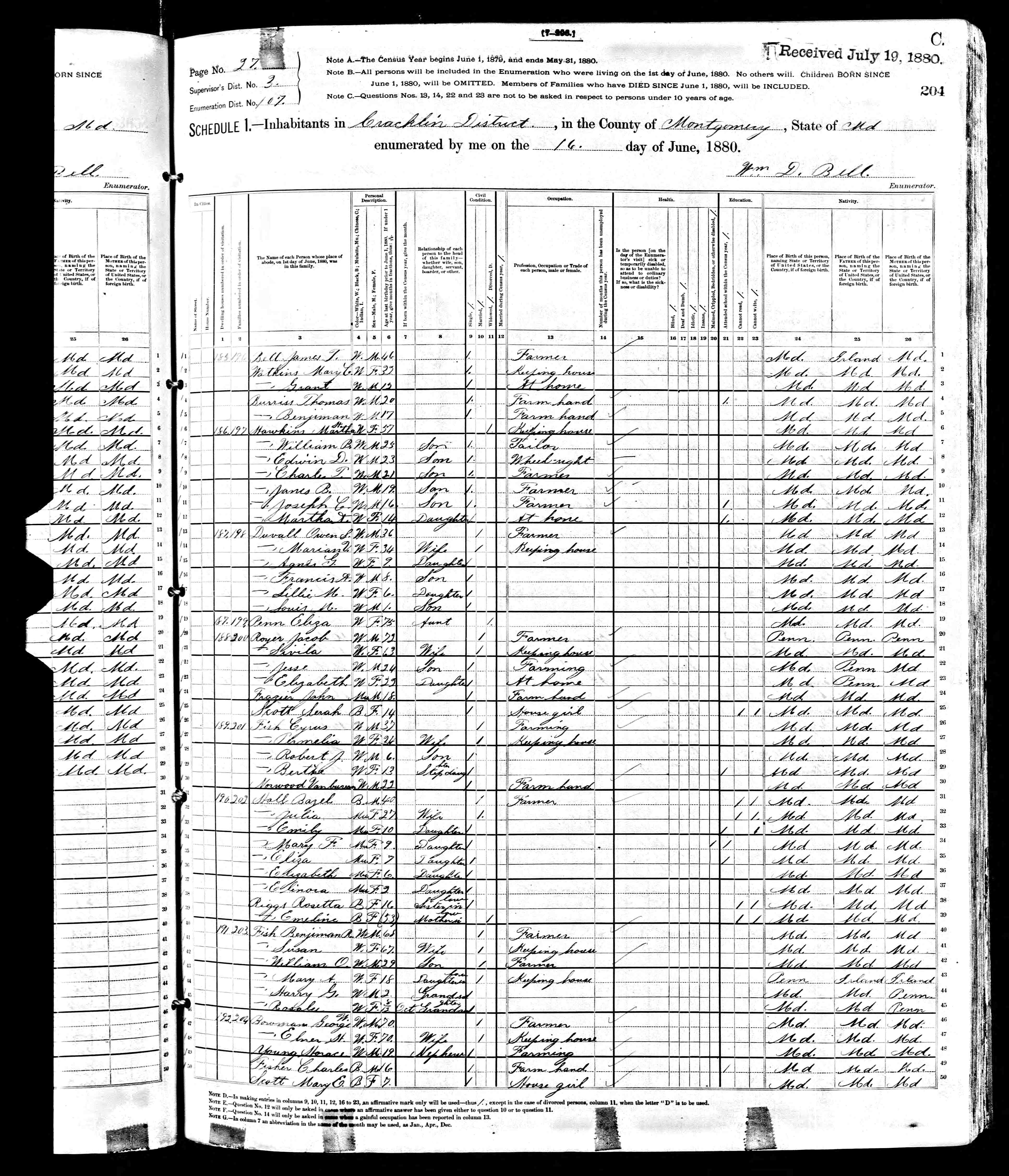 MONTGOMERY COUNTY CIRCUIT COURT, (Marriage Licenses), 1867-1899, [MSA T2490-1], Marriage Record for Bazil Hall and Julia Riggs, April 13, 1868.