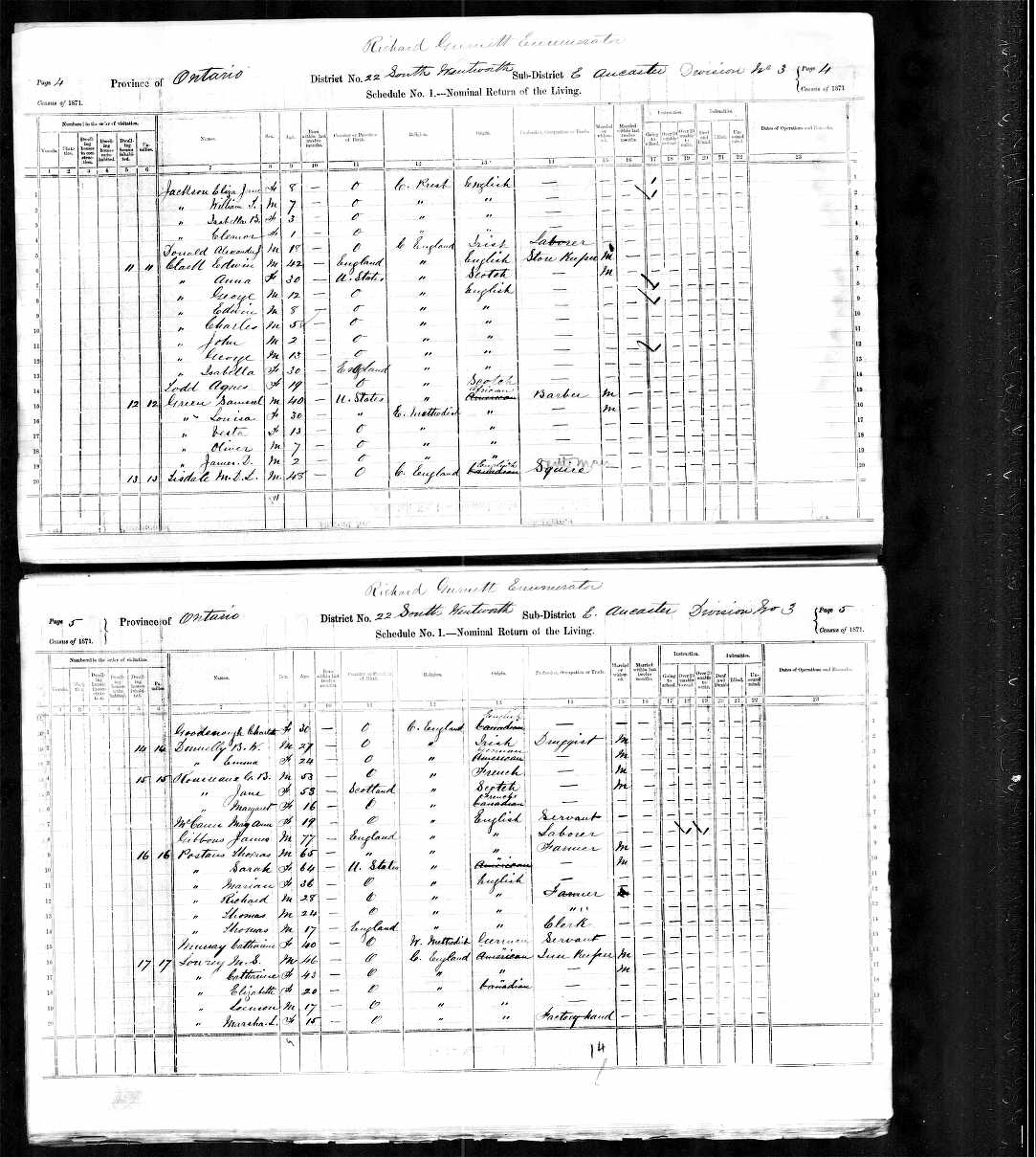 11. Ancestry.com. 1871 Canadian Census, E. Ancaster, South Wentworth, Ontario, p. 72.