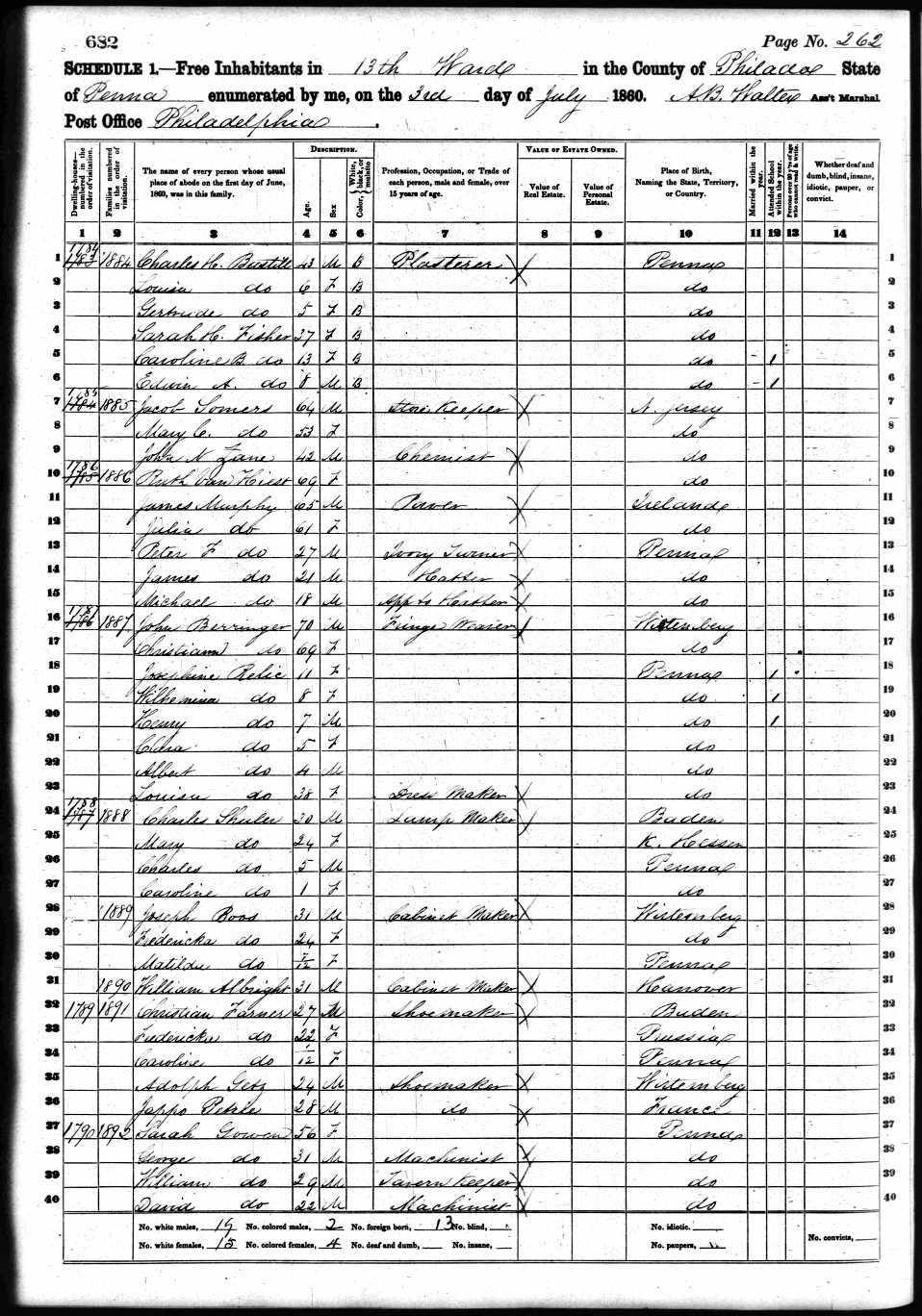 Ancestry.com. 1860 United States Federal Census, Philadelphia, PA, Ward 13, p. 262 .